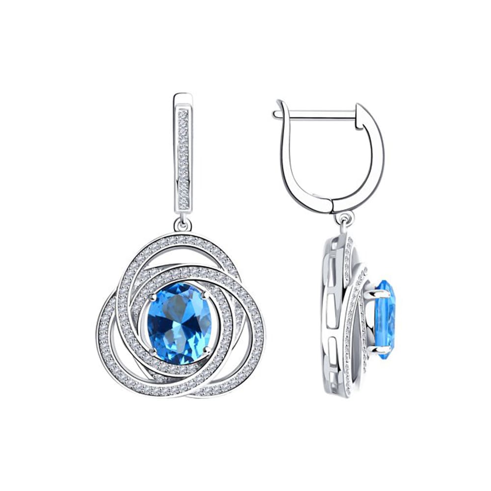 Серебряные серьги 925 пробы с синими ситаллами и фианитами.