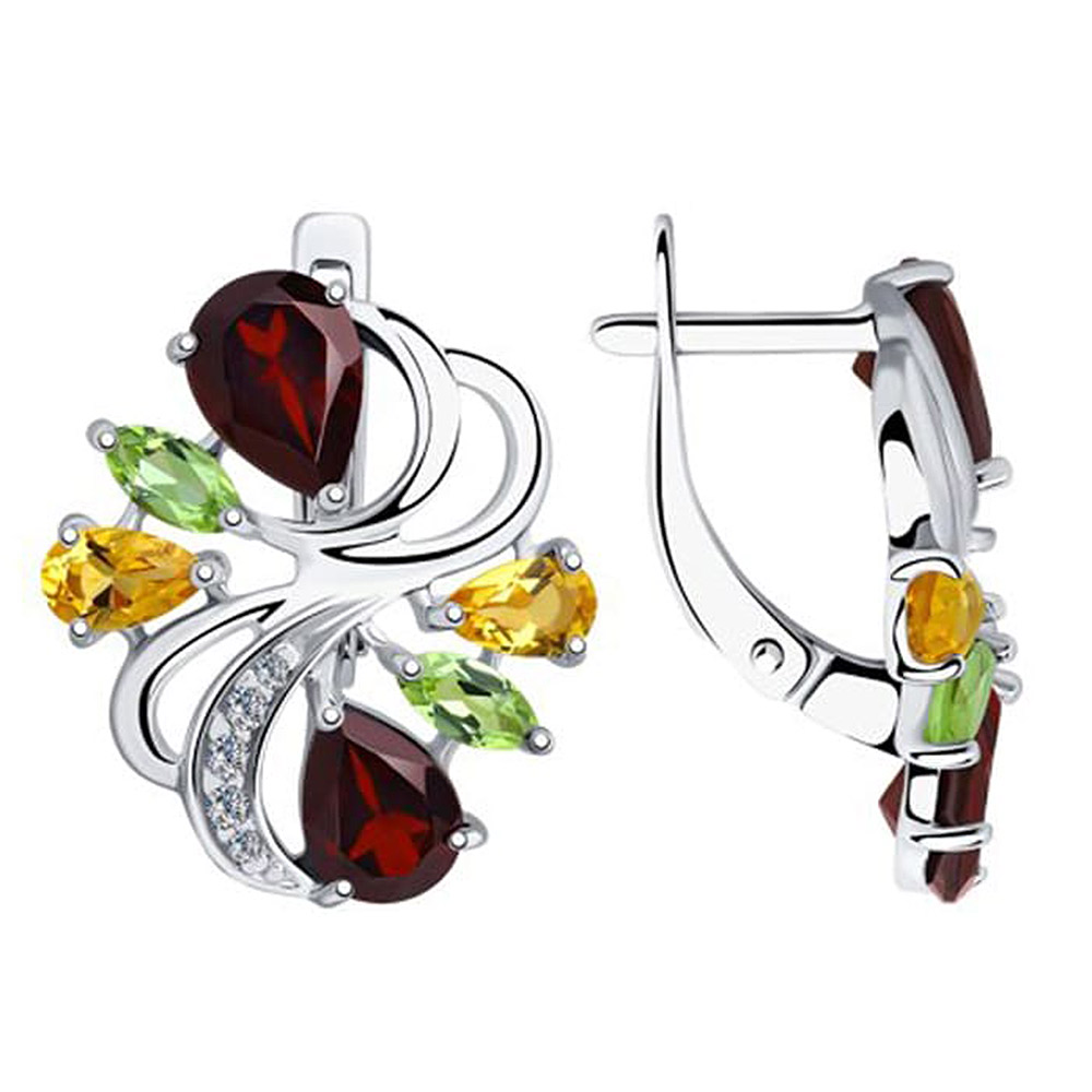 Серьги из серебра 925 пробы, с хризолитами, цитринами, гранатами, фианитами