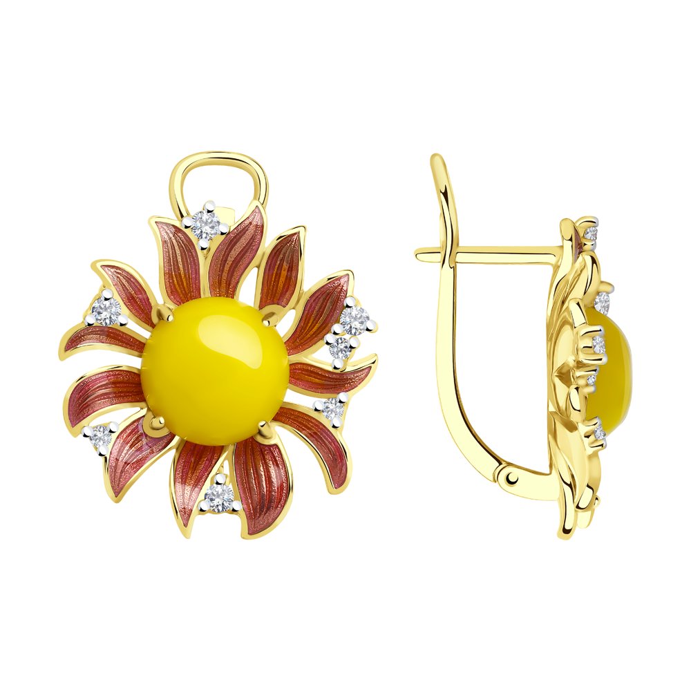 Серьги из серебра 925 пробы с янтарём, кристаллами циркония и эмалью
