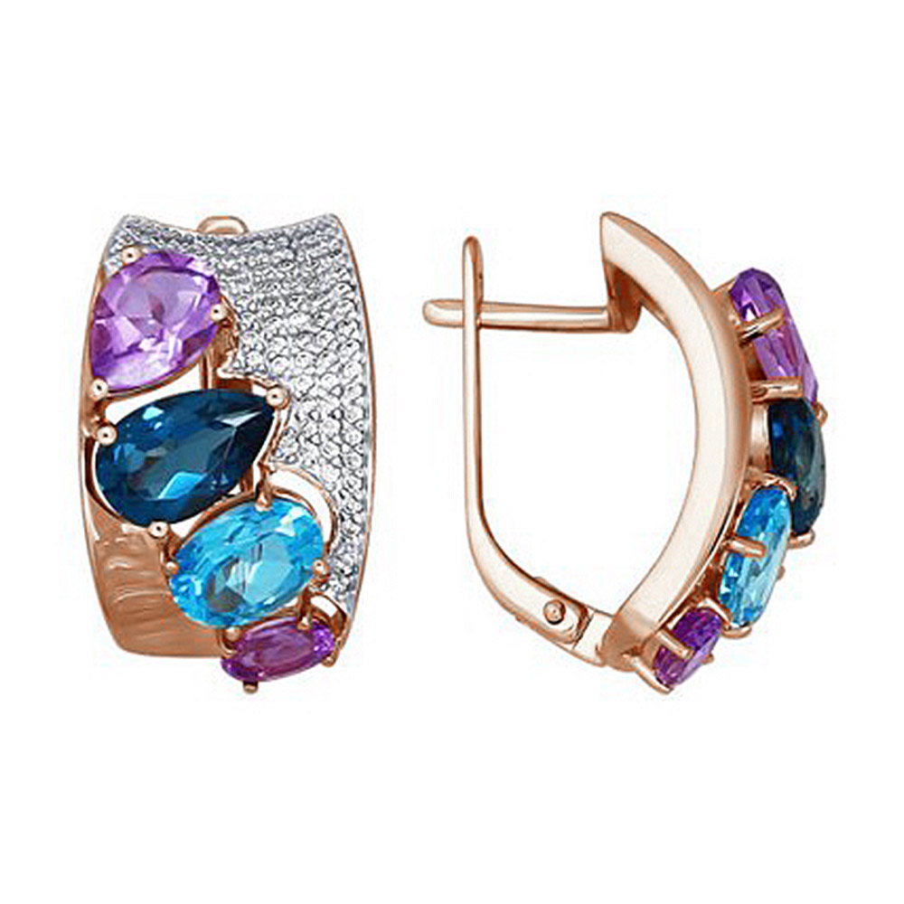 Серьги из золота 585 пробы с голубым топазом, фианитами, аметистом, топазом