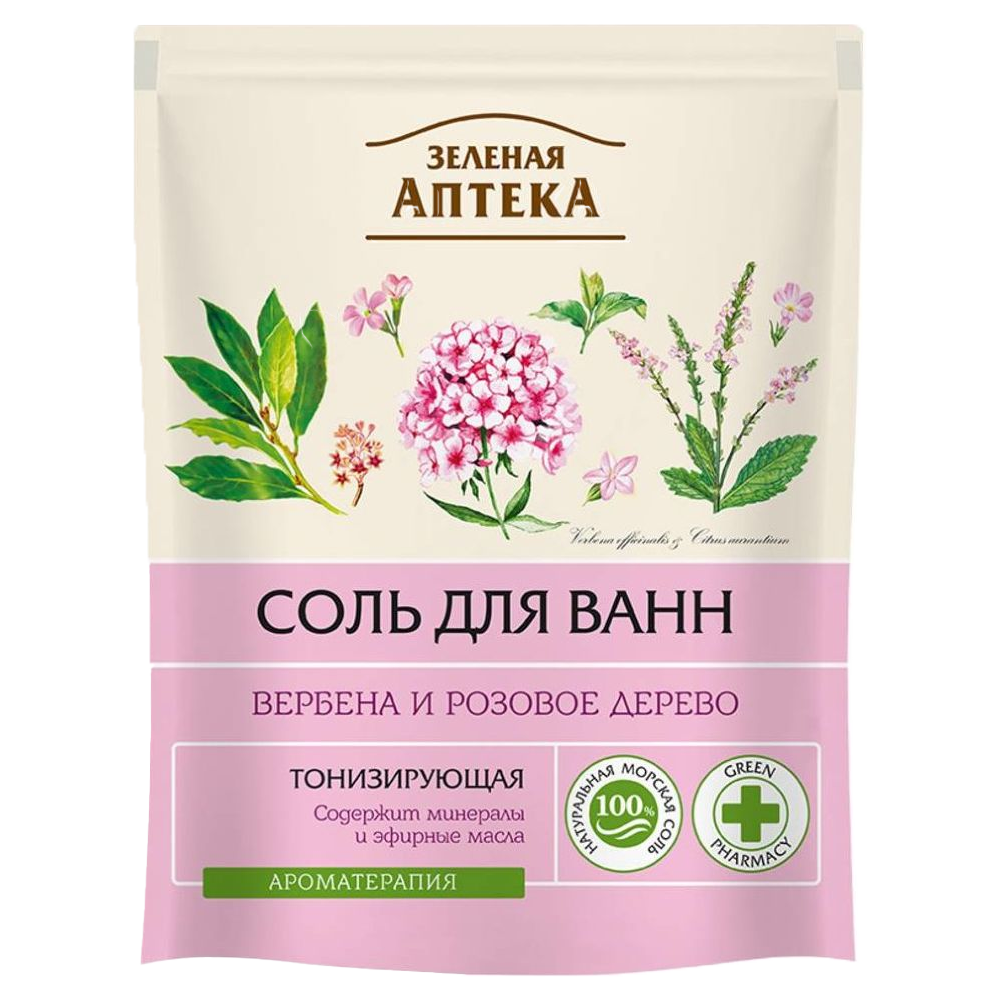 Соль для ванн «Тонизирующия Вербена и розовое дерево» - эффективное средство для ванн на основе натуральной морской соли и эфирных масел от ТМ «Зеленая аптека». Эта соль богата макро- и микроэлементами, а также биоактивными веществами из эфирных масел, поэтому обеспечивает тройной эффект — ароматерапию, релаксацию и заботу о красоте кожи.