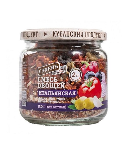 Смесь сушёных овощей «Стоевъ» Итальянская — это концентрат вкуса и аромата средиземноморской кухни. В каждой баночке — смесь тщательно отобранных и щадяще высушенных овощей: помидоры, сладкий перец, морковь, лук, чеснок и зелень. Всё натуральное, без добавок, консервантов и усилителей вкуса.130 грамм сушёной смеси заменяют до 2 кг свежих овощей, экономя место, время и деньги. Достаточно добавить ложку смеси в блюдо, и оно наполняется натуральным овощным вкусом и ароматом.