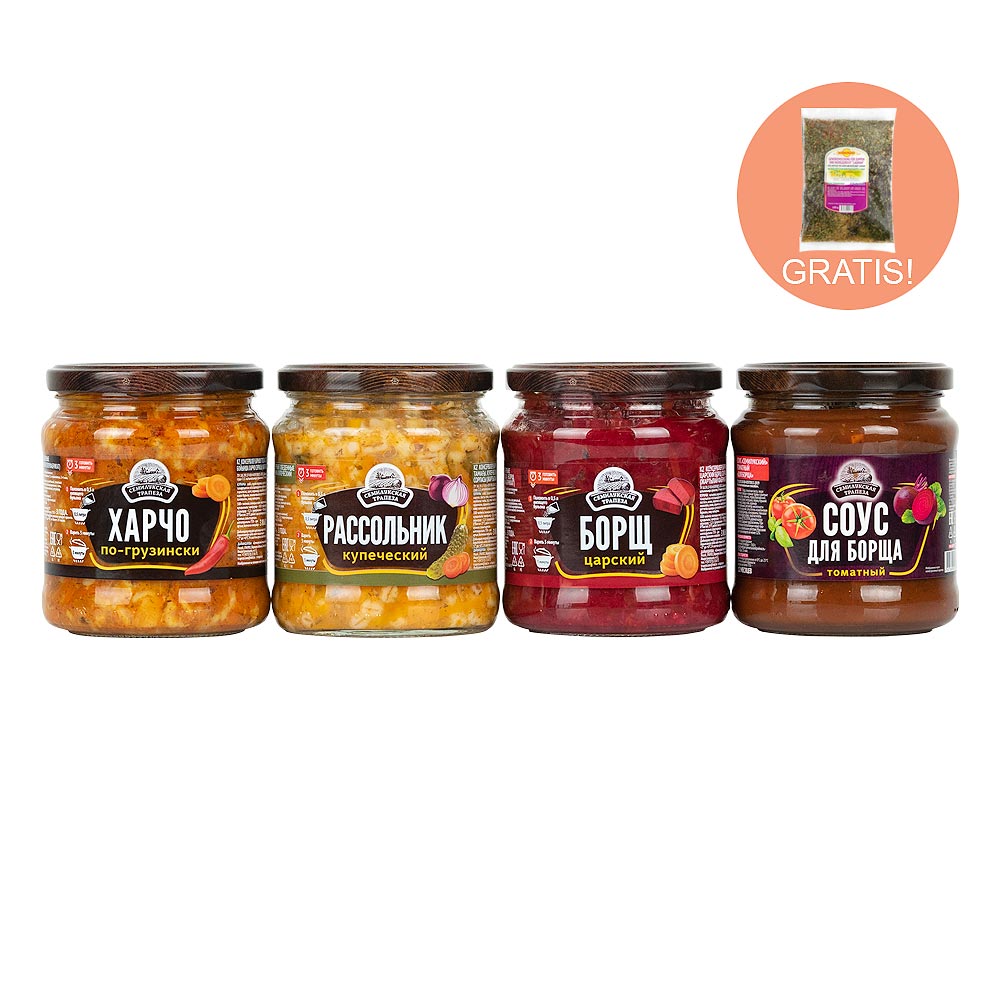 Состав: овощи в разных пропорциях по весу свекла, капуста белокочанная, картофель, морковь, лук репчатый, масло подсолнечное, соль, сахар, томатное пюре, укроп, петрушка, крахмал картофельный, чеснок, регулятор кислотности лимонная кислота, перец черный молотый, лавровый листСредняя пищевая ценность на 100 г Калорийность 290 кДж / 70 ккал жиры