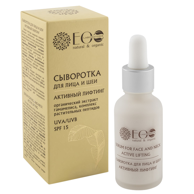 Сыворотка для лица и шеи "Eco Laboratorie" активный лифтинг, SPF 15, 30 мл. Органический экстракт гамамелиса, комплекс растительных пептидов.