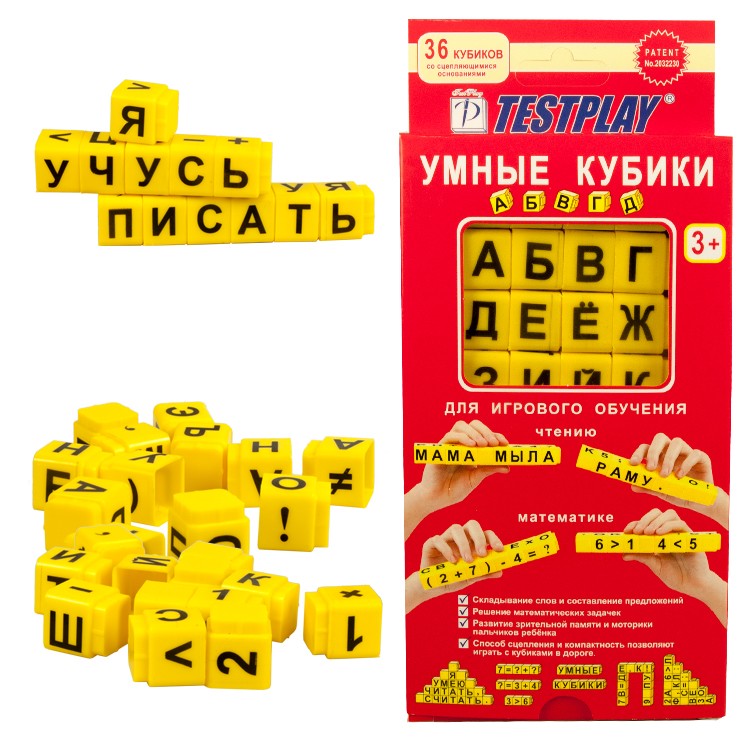 Комплект Умные кубики представляет собой набор из 36 кубиков, на гранях которых написаны буквы русского алфавита, знаки препинания, цифры и знаки математических действий. Благодаря специальной конструкции (выступ с одной стороны и отверстие с другой), кубики могут скрепляться между собой. Таким образом можно составлять слова, предложения, примеры. Так как кубики можно скреплять только определенным способом, ребенок не сможет расположить их неправильно (зеркально или к верх ногами), что важно на этапе обучения, чтобы не сформировались неправильные представления о буквах. Количество букв, цифр и знаков на гранях кубиков выбрано с учетом частоты их использования и позволяет составлять достаточно сложные слова, предложения и примеры. Длина грани кубиков - 1,5 см. Детям удобно их держать и скреплять, в процессе игры тренируется мелкая моторика рук.Основная информация
