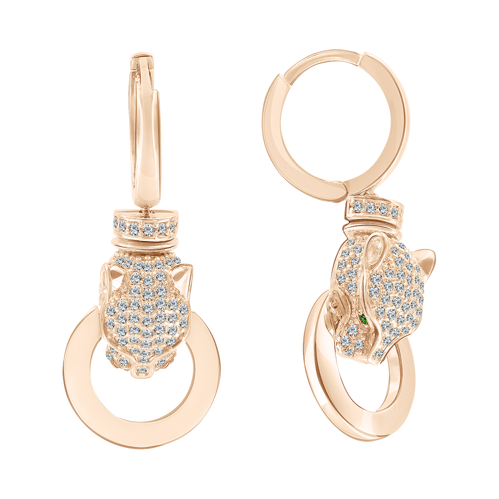Уникальные серьги с головой леопарда из русского красного золота 585 пробы, с бесцветными и зелеными фианитами, застежка - кольцо, высота ≈ 35 мм