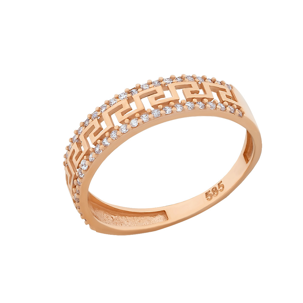 Женское кольцо из 585 красного золото с геометрическим орнаментом и фианитами в 2 ряда