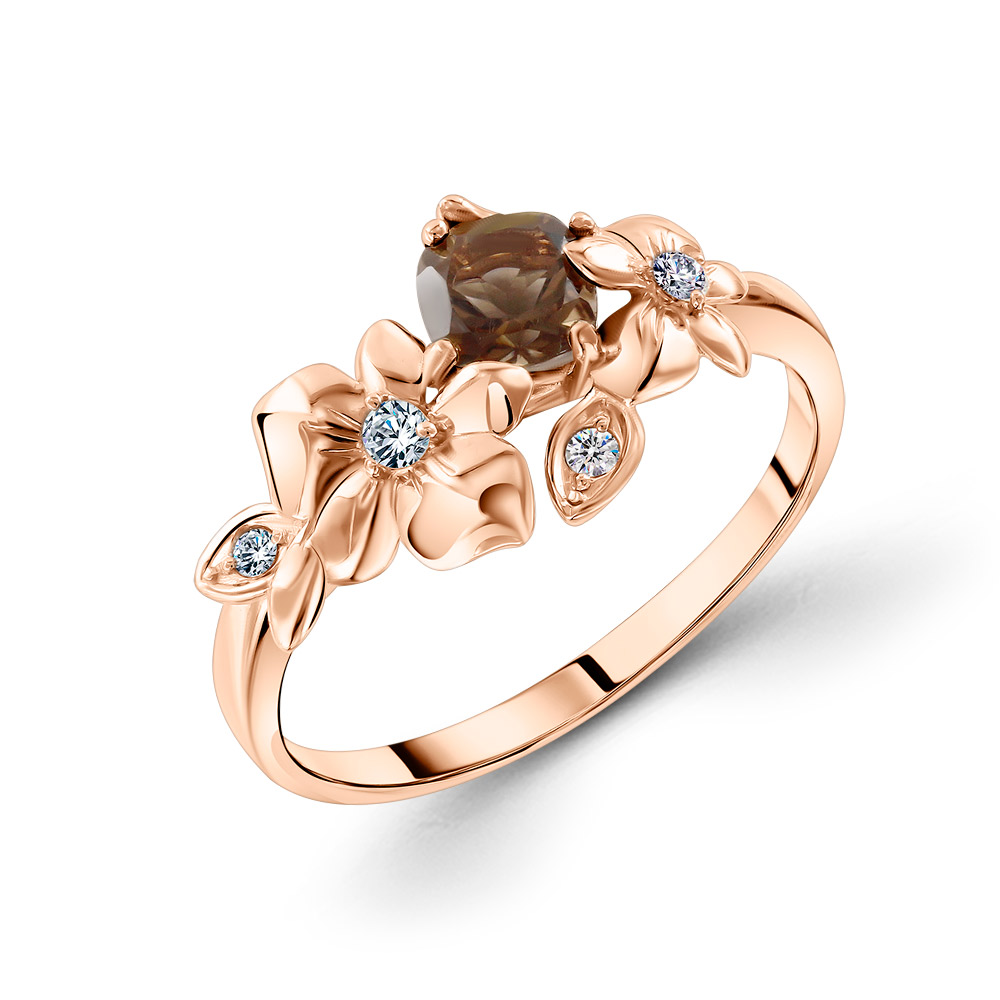 Изящное кольцо из российского красного золота 585 создано для тех, кто ценит утончённость и художественную проработку деталей. В центре композиции — выразительный раухтопаз размером 5×5 мм, чьё глубокое дымчатое сияние идеально оттеняет тёплый блеск золота.Кольцо украшено объёмными цветами и листочками, выполненными с особой точностью — они создают атмосферу нежности и природного вдохновения. Искрящиеся фианиты, аккуратно размещённые в лепестках, добавляют игре света и подчёркивают женственный характер украшения.