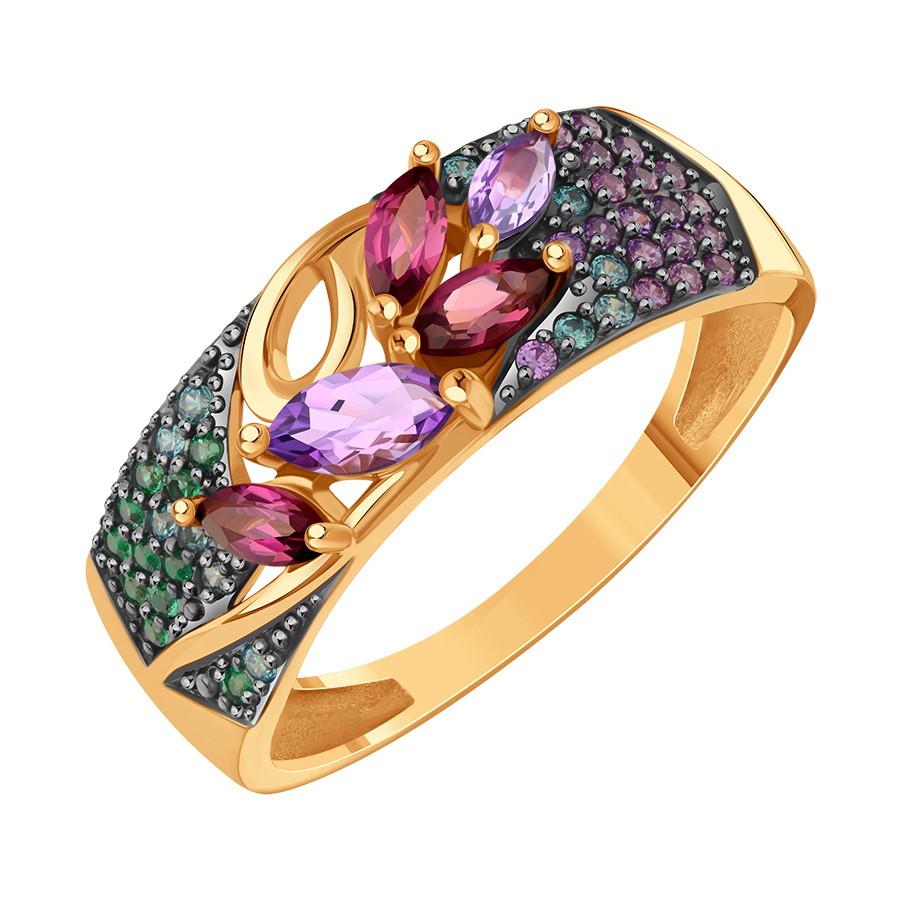 Эффектное женское кольцо из золота, украшенное вставками из аметиста, родолита и разноцветных фианитов.