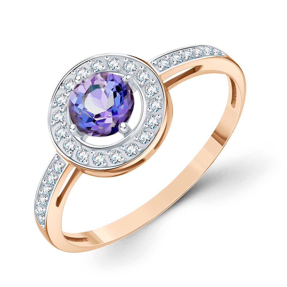 Женское кольцо из красного золота 585 пробы с танзанитом Ø ок. 6 мм и с фианитом, головка кольца Ø ок. 10 мм
