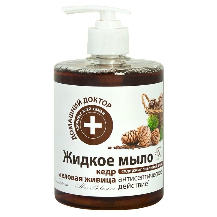 Жидкое мыло Кедр и Еловая живица от ТМ Домашний Доктор - это отличное средство для чистоты и здоровья кожи, может использоваться в качестве геля для душа, в том числе. рН  средства составляет 5,5 — максимально приближено к физиологическому рН кожи. Приятная пена обладает очень легким, едва уловимым ароматом, легко распределяется и смывается, не оставляя неприятного ощущения скользкости.Кедровое масло и еловая живица — это уникальные дары природы, которые дарят красоту, силу и здоровье каждой клеточке кожи, наполняя их жизненной энергией. Мыло бережно очищает, смягчает, предотвращает обезвоживание, повышает упругость и эластичность кожи. Жидкое мыло Кедр и Еловая живица эффективное средство для жирной кожи и лечения угревой сыпи, а также оказывает сильное антисептическое действие и отлично тонизирует кожу.Способ применения: нанести на влажную кожу, вспенить, смыть водой.