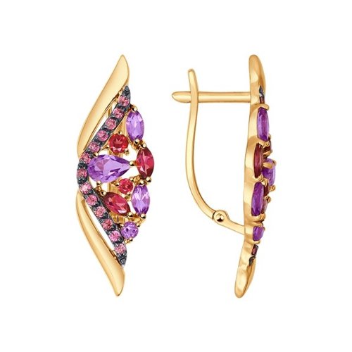 Золотые серьги 585 пробы с аметистом и малиновым родолитом